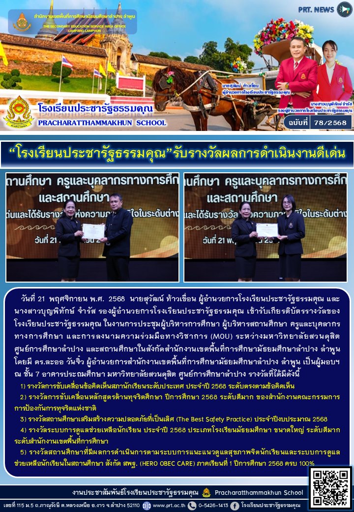 "โรงเรียนประชารัฐธรรมคุณ" รับรางวัลผลการดำเนินงานดีเด่น
