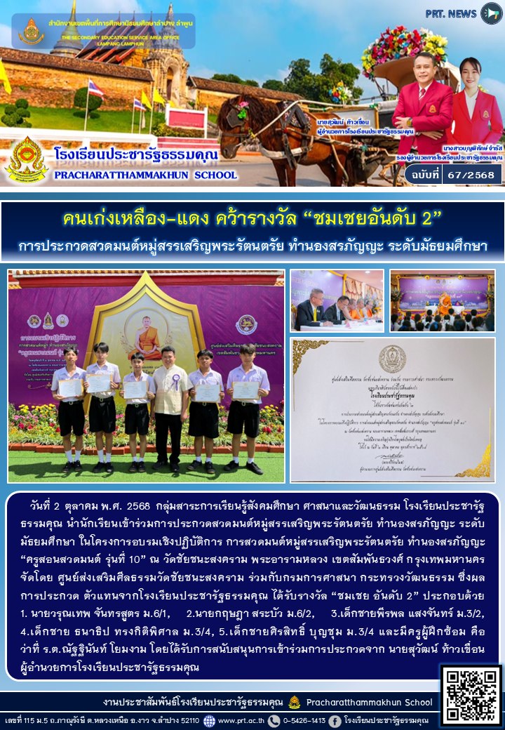 คนเก่งเหลือง-แดง คว้ารางวัล \"ชมเชยอันดับ 2\" การประกวดสวดมนต์หมู่สรรเสริญพระรัตนตรัย ทำนองสรภัญญะ ระดับมัธยมศึกษา