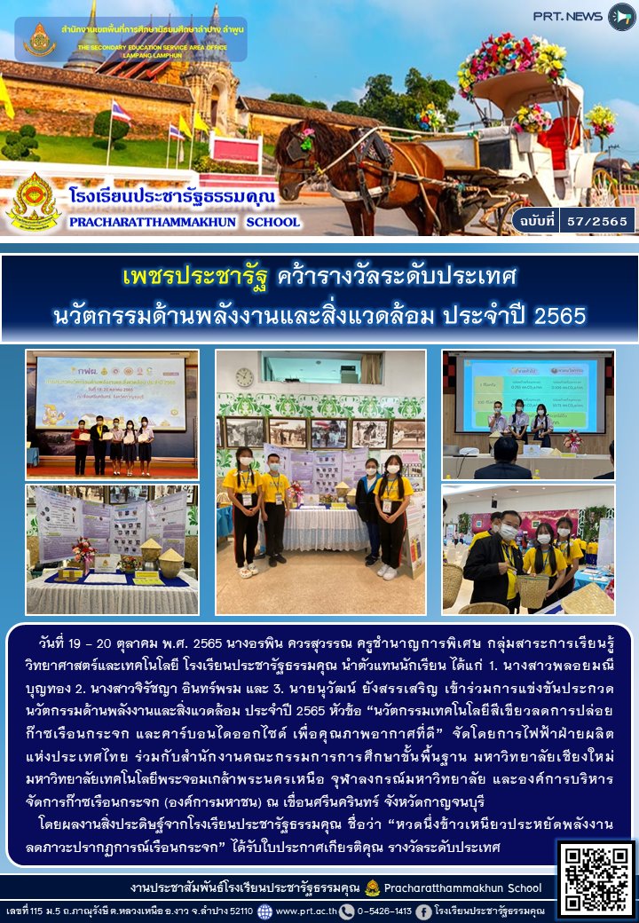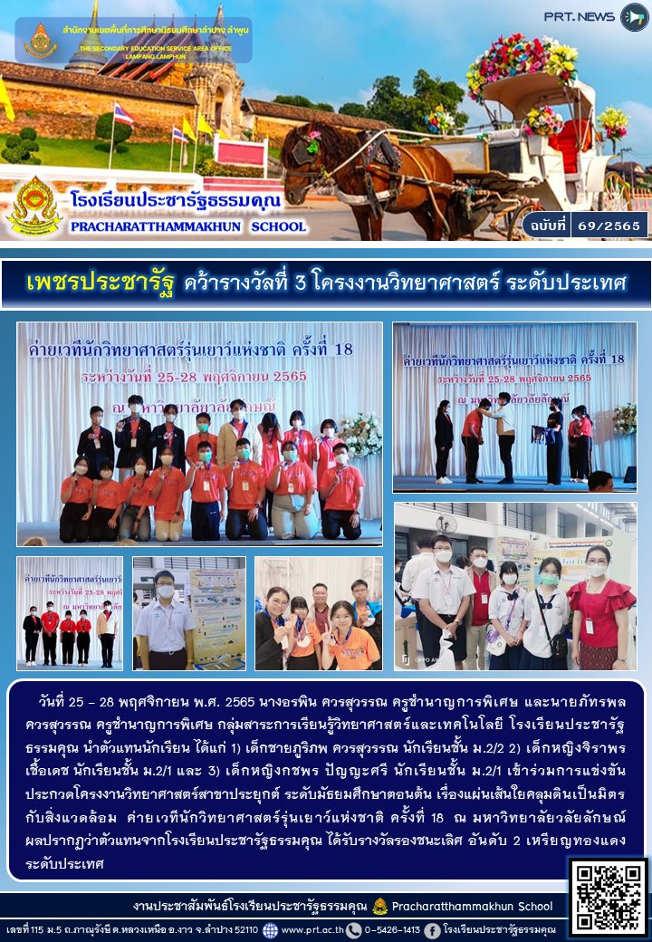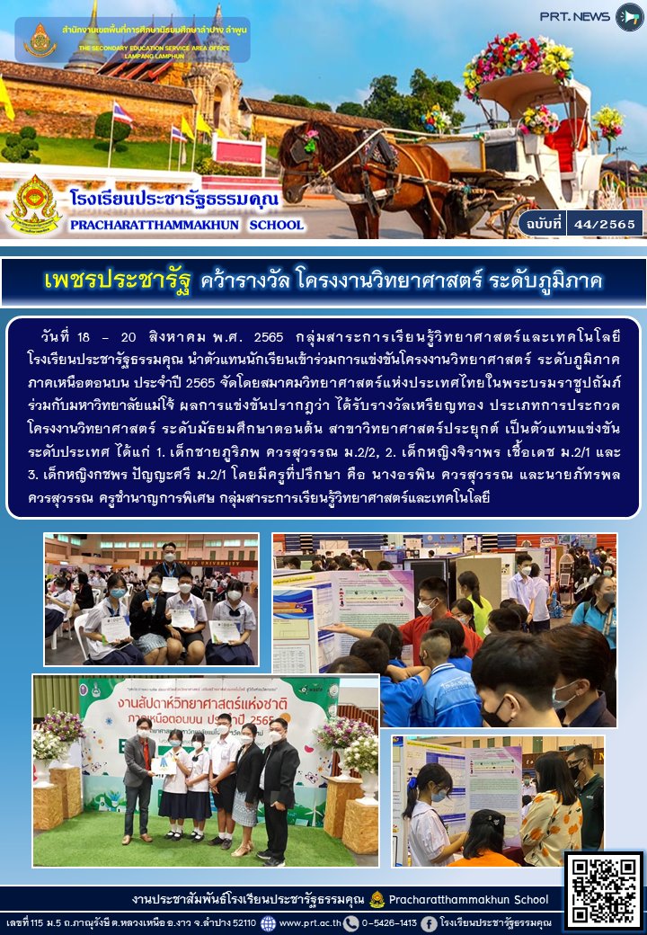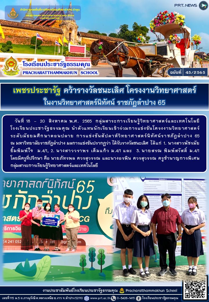 รางวัลชนะเลิศ การแข่งขันโครงงานวิทยาศาสตร์ ระดับมัธยมศึกษาตอนปลาย ในงานวิทยาศาสตร์นิทัศน์ราชภัฎลำปาง 65