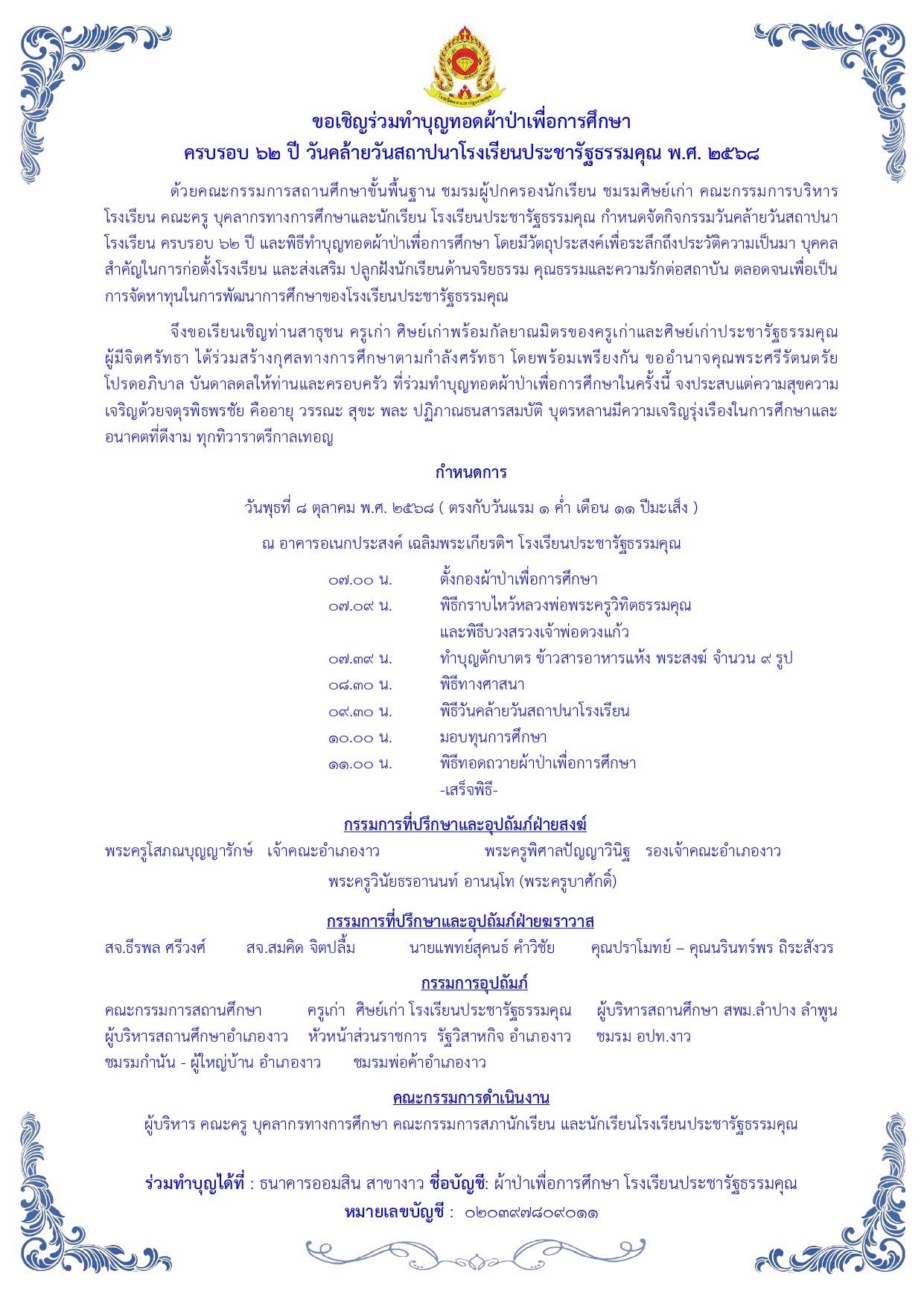 ขอเชิญร่วมทำบุญทอดผ้าป่าเพื่อการศึกษา ครบรอบ 62 ปี วันคล้ายวันสถาปนาโรงเรียนประชารัฐธรรมคุณ 8 ตุลาคม 2568