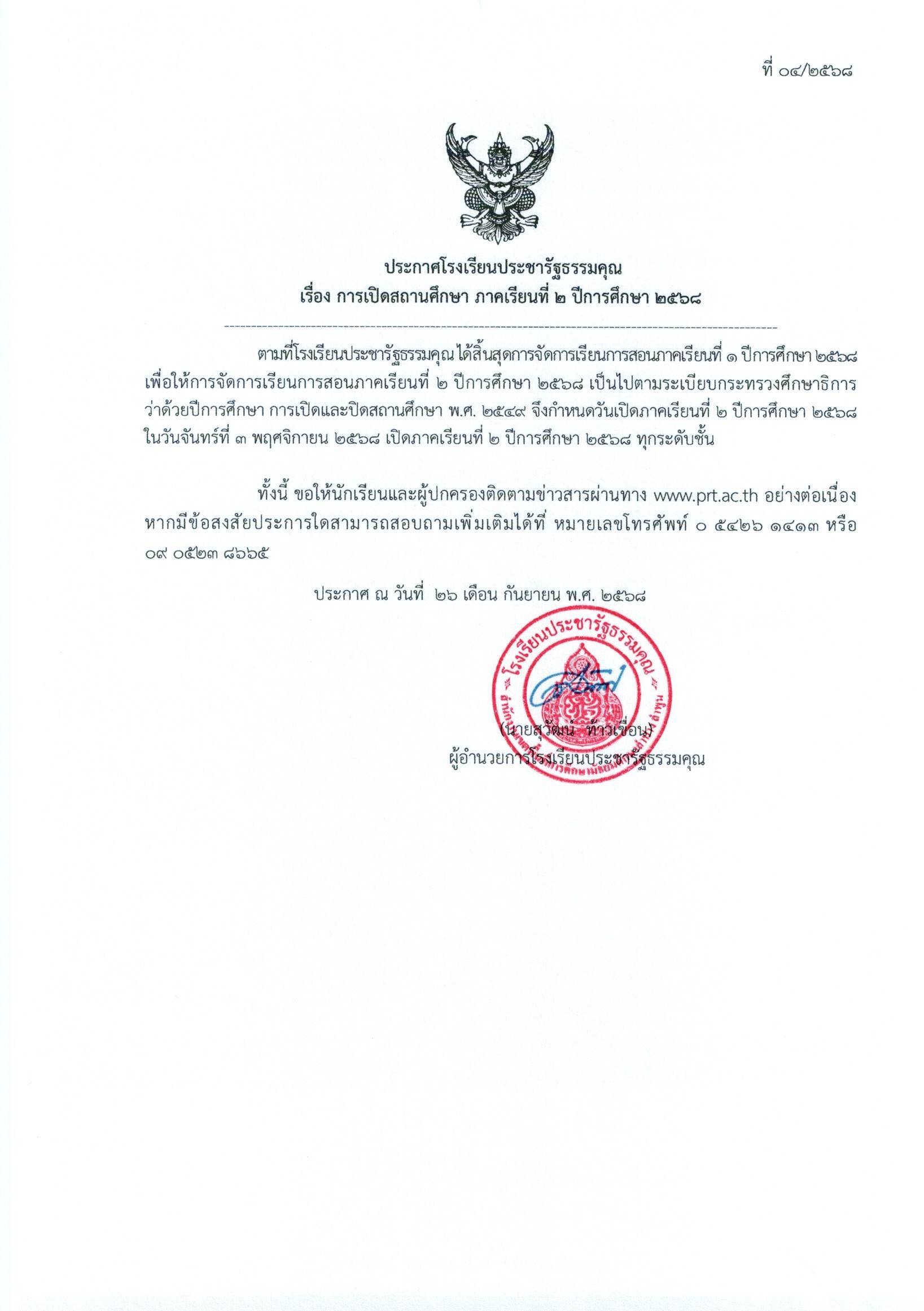 ประกาศโรงเรียนประชารัฐธรรมคุณ เรื่อง การเปิดสถานศึกษา ภาคเรียนที่ 2 ปีการศึกษา 2568