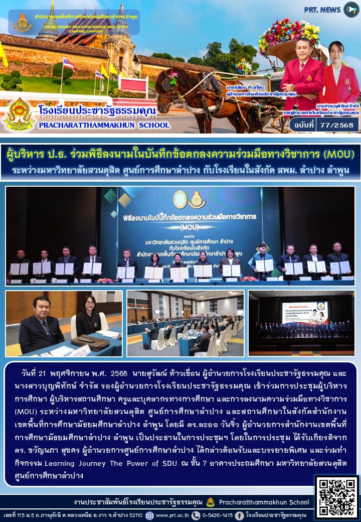 ผู้บริหาร ป.ธ. ร่วมพิธีลงนามในบันทึกข้อตกลงความร่วมมือทางวิชาการ (MOU) ระหว่างมหาวิทยาลัยสวนดุสิต ศูนย์การศึกษาลำปาง กับโรงเรียนในสังกัด สพม.ลำปาง ลำพูน